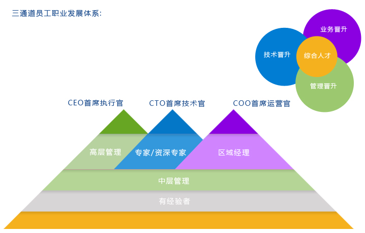 在公司人才戰(zhàn)略的指引下,我們積極拓展員工個(gè)人發(fā)展空間,為員工設(shè)計(jì)個(gè)性化的職業(yè)生涯發(fā)展規(guī)劃。立足于完善的企業(yè)管理制度與培訓(xùn)體系,我們?yōu)閱T工提供技術(shù)通道晉升、業(yè)務(wù)通道晉升與管理通道晉升的“三條通道”發(fā)展模式,從而使員工在基于個(gè)人興趣與專長(zhǎng)的基礎(chǔ)上更好的實(shí)現(xiàn)自身價(jià)值與公司價(jià)值的結(jié)合,實(shí)現(xiàn)自身與公司的一同成長(zhǎng)。